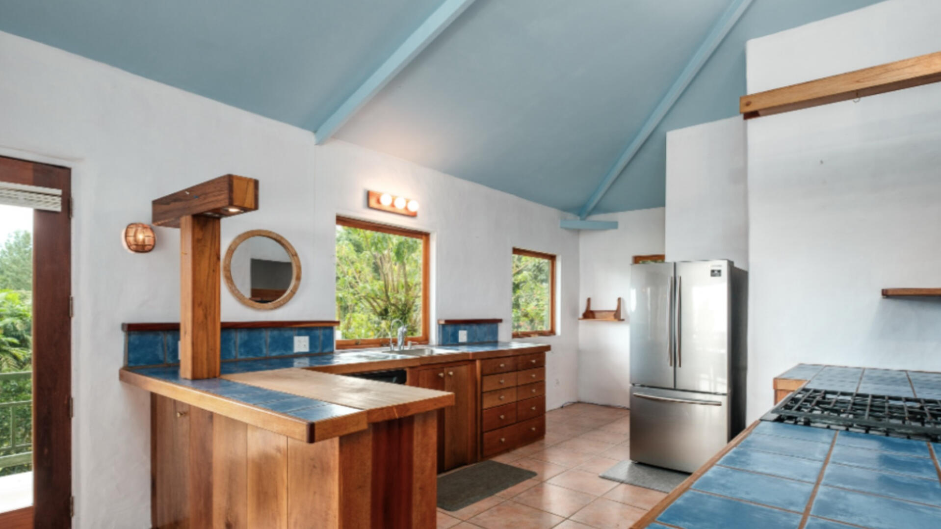 The kitchen is full of sunlight and features premium cedar cabinetry and modern